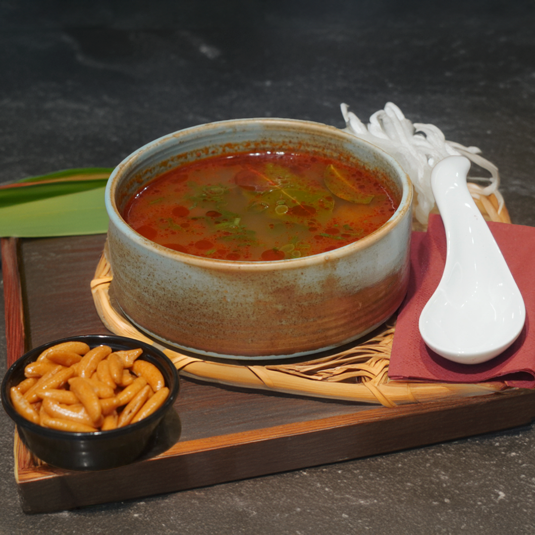 Thai soup with shrimp, mushroom, bay leaf, ginger, and coconut milk.